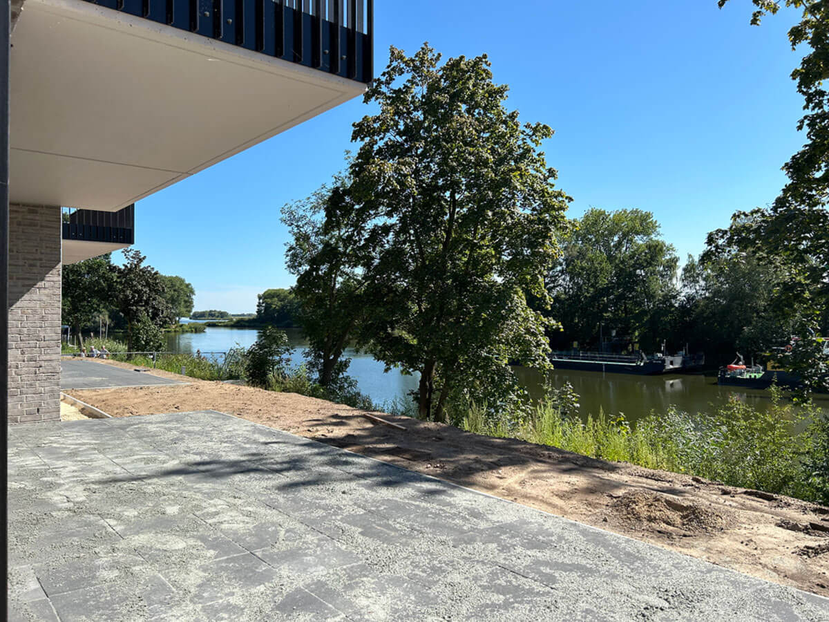 Visualisierung der selben Terrasse am Abend mit Besuch von zwei Freund*innen im Neubauprojekt Waterkant Geesthacht. Visualisierung eines Paares mit Hund auf der Terrasse im Erdgeschoss im Neubauprojekt Waterkant Geesthacht.