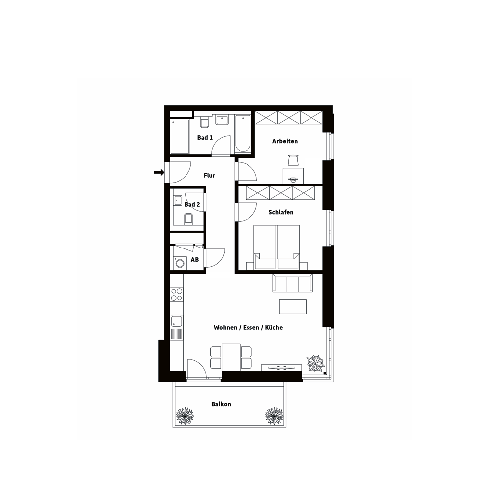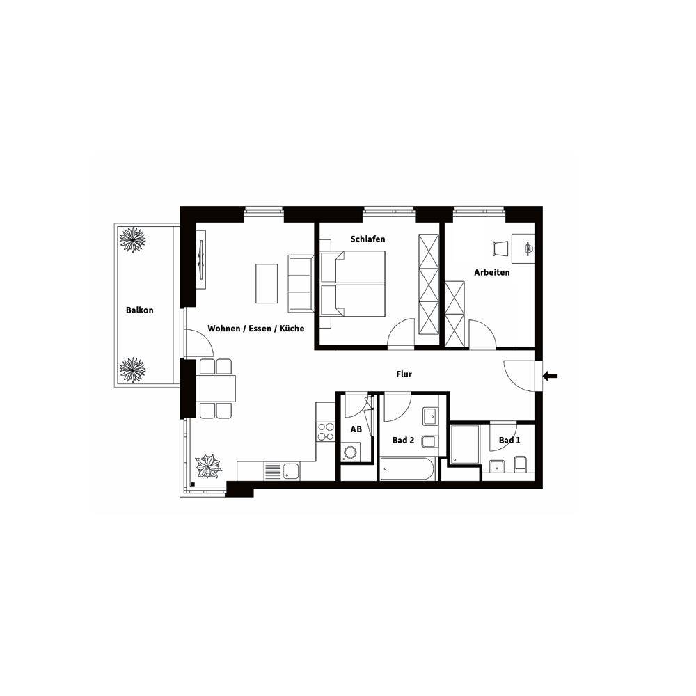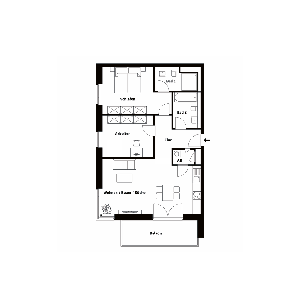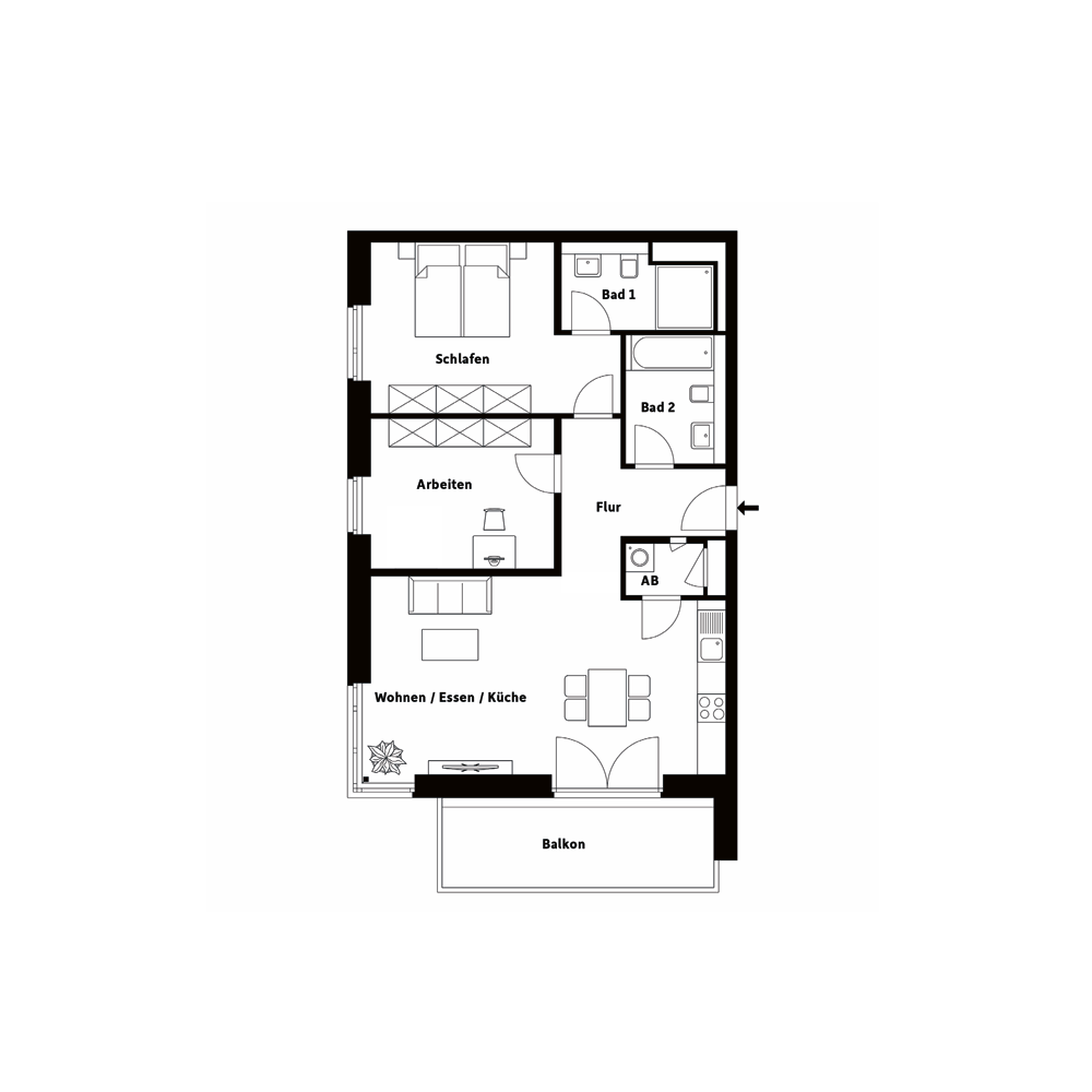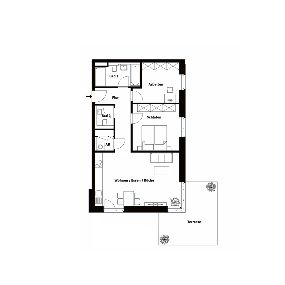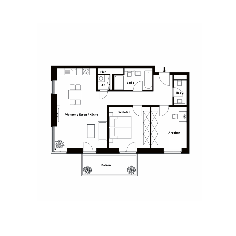 2 Zimmer, ca. 66,40 m² Wohnfläche
